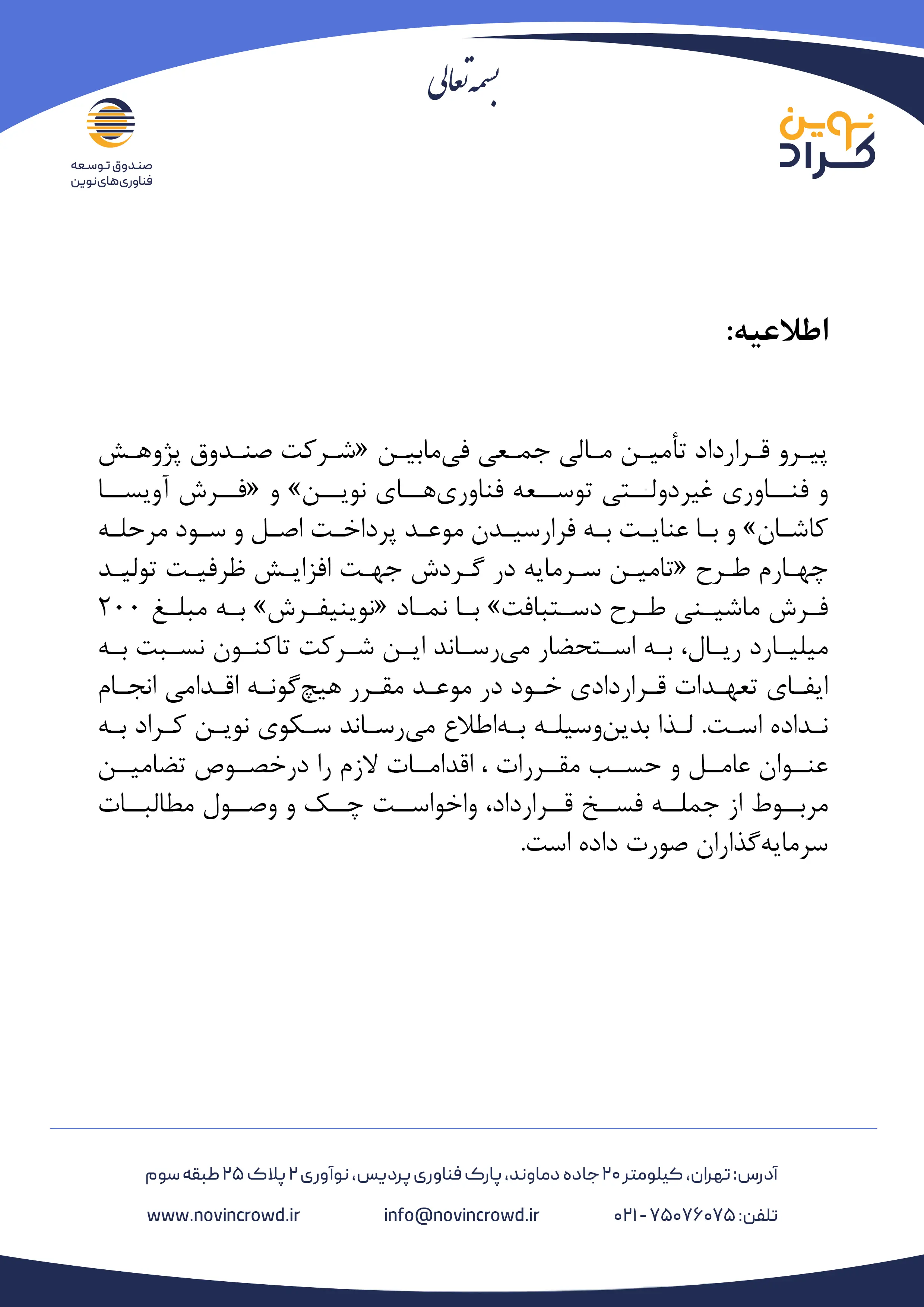با توجه به سرمایه گذاریتون در پنل کاربریتون و همچنین آدرس https://novincrowd.ir/installment قابل مشاهده است