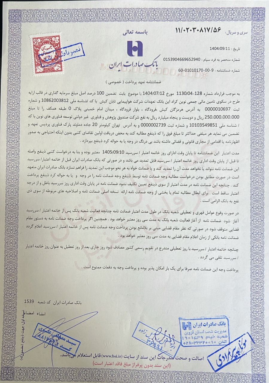 با توجه به سهم بازار مناسب شرکت در صنعت هواپیمایی حمل و نقل هوایی و همچنین ارتباط لازم مناسب برای توسعه بازار محصولات ذکرشده، طرح با دریافت تضامین معتبر دارای توجیه‌پذیری است.