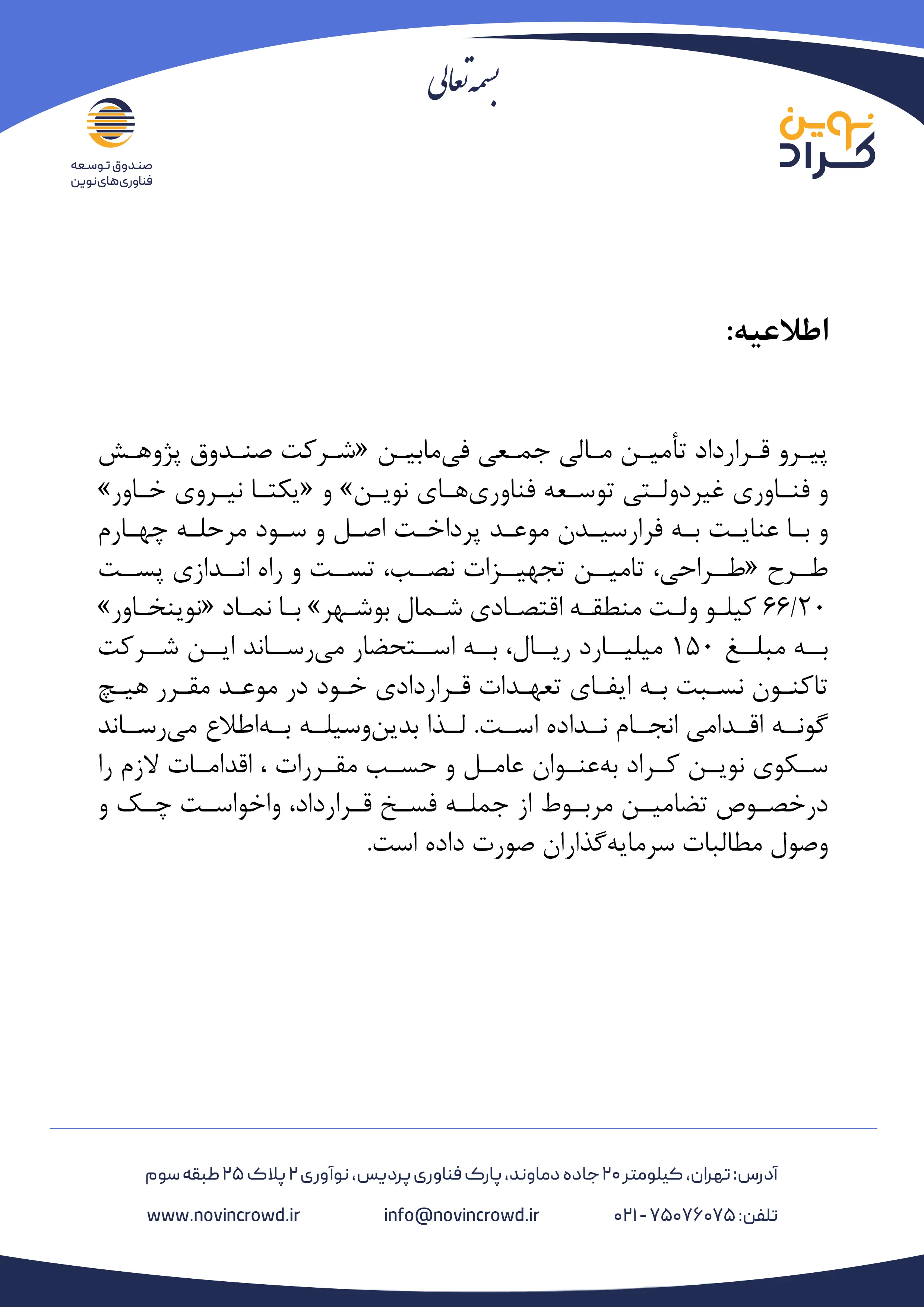 با توجه به فعالیت شرکت در حوزه پیمانکاری برق و ساختمان و درآمد عملیاتی مناسب سال 1402 ، و سابقه مناسب شرکت در انجام پروژه های مشابه طرح فوق و دانش فنی مناسب شرکت در حوزه پیمانکاری برق قدرت، پیشنهاد می گردد سکوی تامین مالی جمعی تا سقف 150 میلیارد ریال در دستور کار قرار گیرد. فلذا با توجه به ارائه ضمانت نامه تعهد پرداخت توسط شرکت، تامین مالی جمعی با چک ایشان ریسک متوسط رو به کم را دارا خواهد بود.